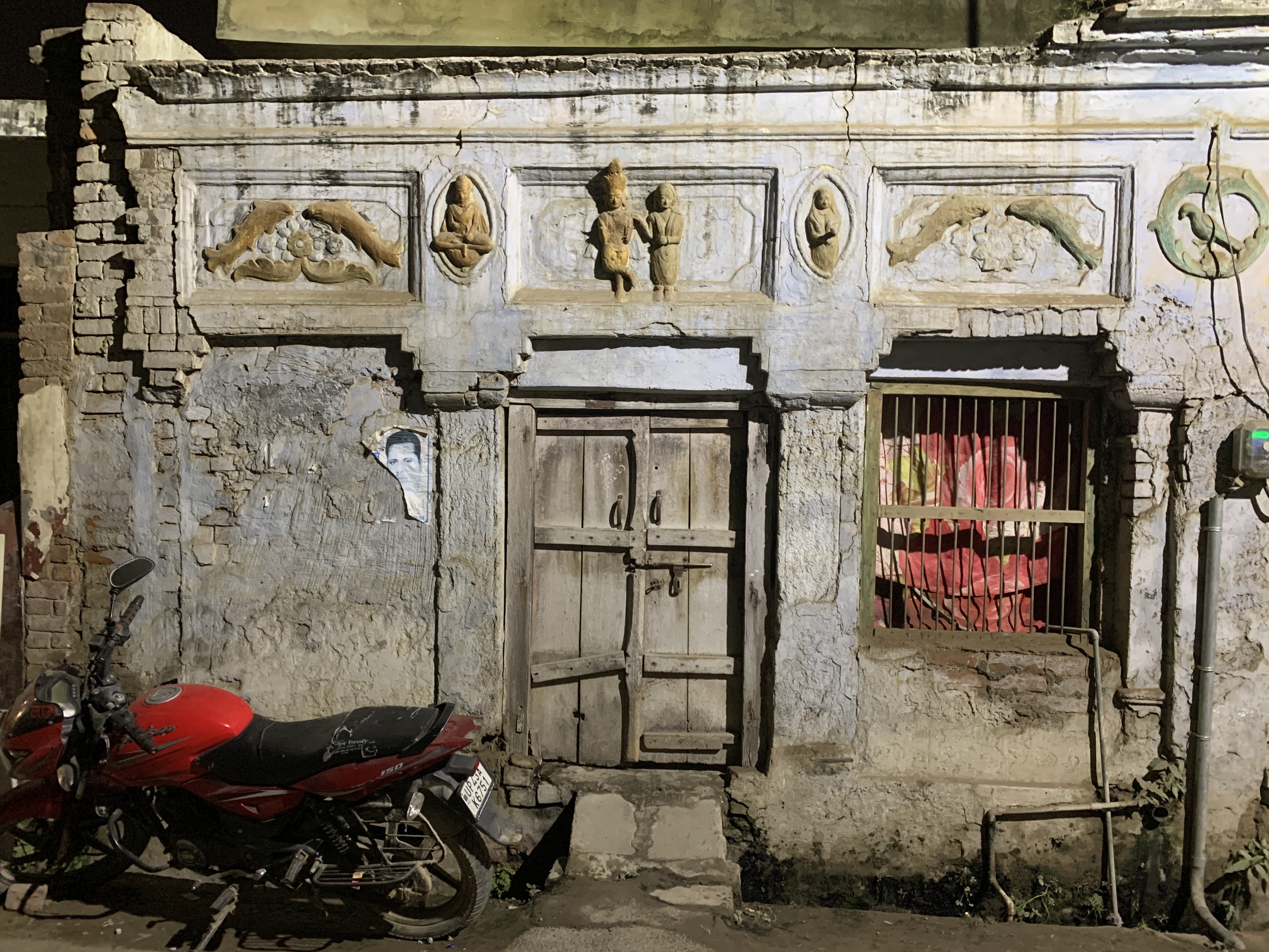 The traveller looks at the faces around him and thinks: our paths will likely never cross again. When a boy comes running up and offers to stencil Ram on my forehead for 10 rupees, I do not refuse the badge of the moment. The stencils are themselves part of a giant new economy of Ram paraphernalia flooding the puja samagri shops of the city: wooden replicas of the new Ram Mandir, Jai Shri Ram plaques, Jai Shri Ram ballpoint pens, Jai Shri Ram car dashboard standees, Hanuman maces, Jai Shri Ram pennants, and Jai Shri Ram charan padukas.